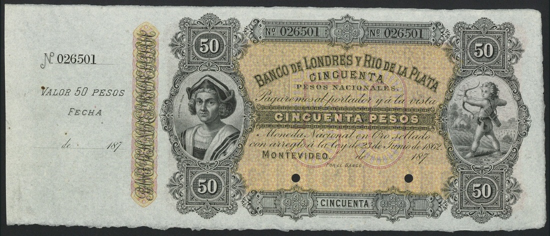 (†) Banco de Londres y Rio de la Plata, Uruguay, specimen 50 pesos, Montevideo, 187-, serial number 026501, black, brown and mauve, Columbus at left, cherub in bow at right, counterfoil at left, reverse red, blue, green and brown, two medallic female heads at centre, counterfoil at left