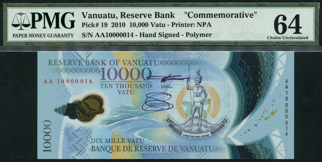 (x) Reserve Bank of Vanuatu, commemorative issue 10,000 vatu, ND (2010), serial number AA 10000014, blues and green, Melanesian chief at centre right, conch shell at left, reverse, post office in Port Villa