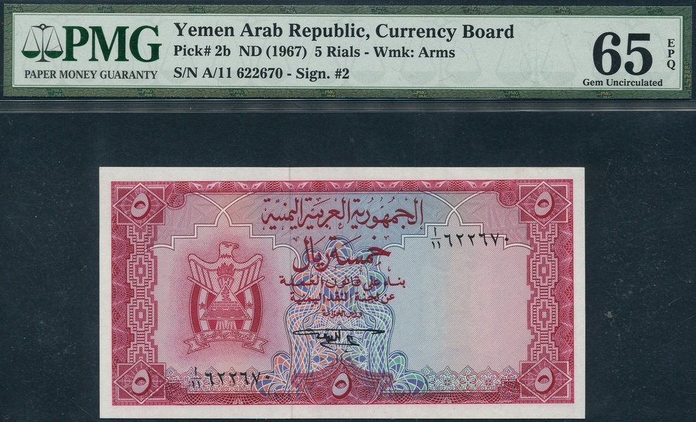 (Pick 2b), in PMG holder number 65, EPQ gem uncirculated, deceptively scarce denomination and the key note for the Yemen series