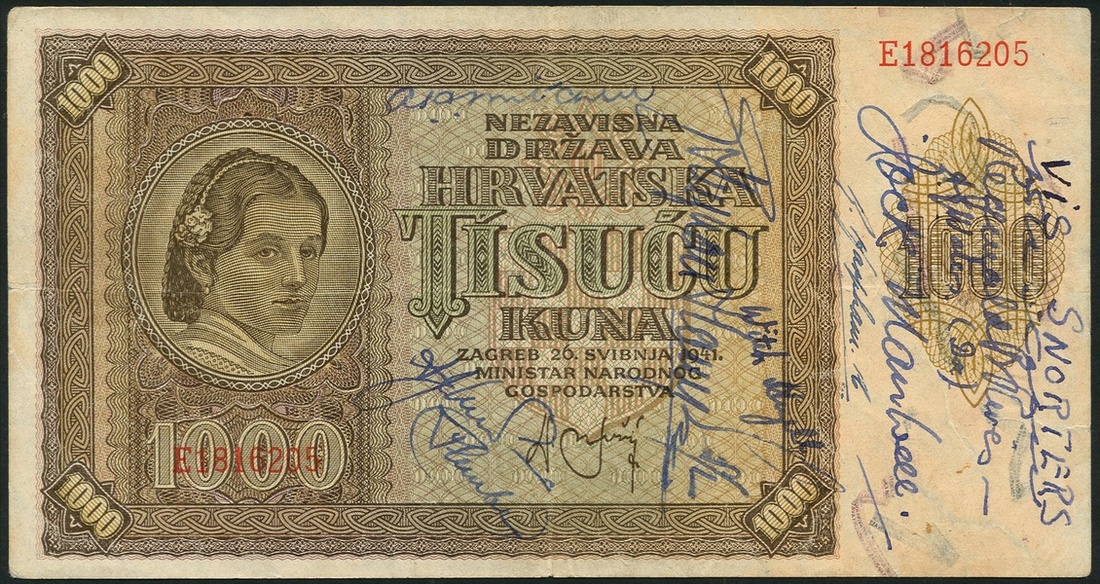 Croatia, 1000 kuna, 1941, serial number E1816205, brown on light tan, portrait of woman in circular frame at left, manuscript 'VIS SNORTERS' at right with a number of signatures, reverse, bank title and value at centre with mountains in background