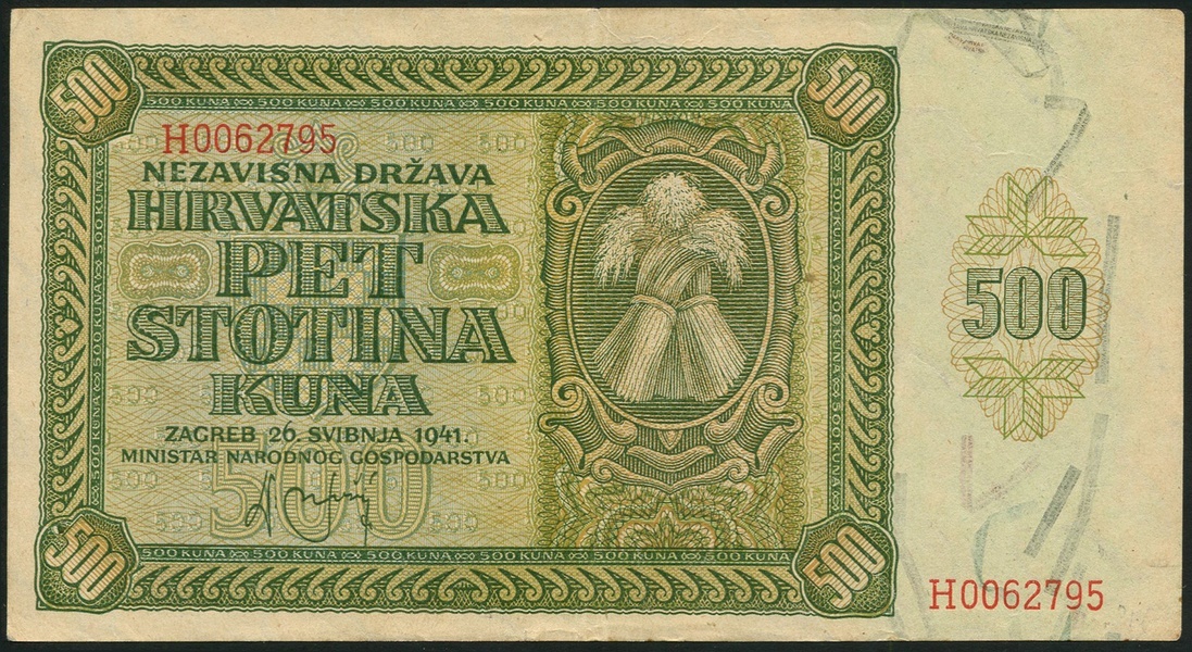 Croatia, 50 kuna, 1941, serial number J0322303, red, 100 kuna, 1941, serial number D4754921, grey-blue, 500 kuna, 1941, serial number H0062795, green, 1000 kuna, 1941, serial number P1500681, brown, 10 kuna, 1941, serial number V221674, brown, 50 banica, 1942, serial number AC021119, brown and red, 1 kuna, 1942, serial number AJ197552, dark brown, 2 kune, 1942, serial number CB159835, reddish brown, 50 kuna, 1944, serial number AX381949, brown, 50 kune, 1944, no serial number