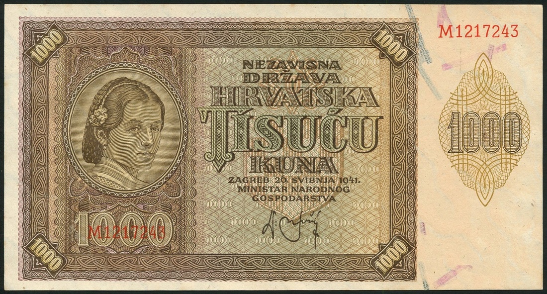 Croatia, 50 kuna, 1941, serial number O0482705, 100 kuna, 1941, serial number C4437575, 500 kuna 1941, serial number J0607158, 1000 kuna, 1941, serial number M1217243, 10 kuna, 1941, serial number L113335, 20 kuna, 1944, serial number AO383250, 50 kuna, 1944, no serial number, 100 kuna, 1943, serial number G2780639