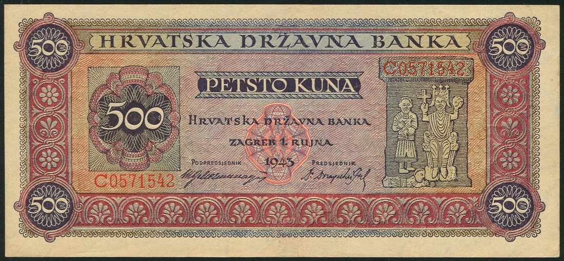 Croatia, unissued 500 kuna, 1943, serial number C0571542, lilac on multicolour underprint, bank title top centre, allegorical figures at right, ornate border, reverse, woman in traditional costume at centre flanked by value