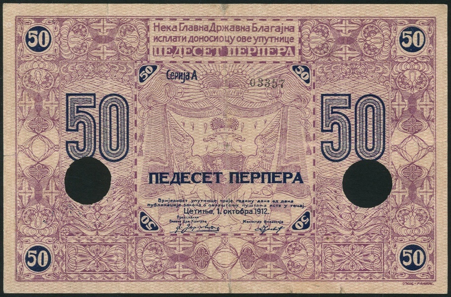 Kingdom of Montengro, Treasury, 50 perpera, 1 October 1912, serial number A03357, blue and lilac, also Royal Government issue, 1 and 2 perpera, 25 July 1914, blue and lilac respectively, all with arms at centre, value at left, right and each corner, last two with red overprints, all with cancellation holes