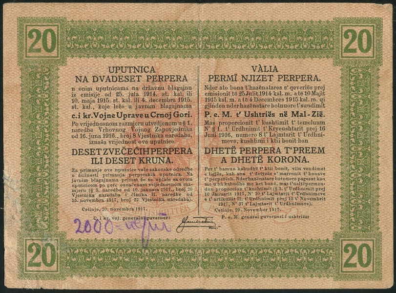 Montenegro, Austrian Military Administration, 5, 10 and 20 perpera, 5 June 1917, red, blue and orange-brown respectively, arms in underprint, value at each corner