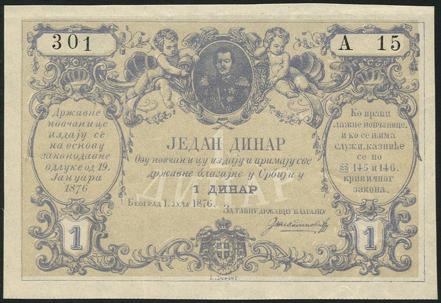Kingdom of Serbia, State notes, 1 dinar, 1 July 1876, serial number A 15-301, pale blue and pale grey-green, Prince Obrenovich at centre, cherub at left and right, also 10 dinars, 2 January 1893, serial number O.869-748, blue and pink-red, maiden with lute and bow at left