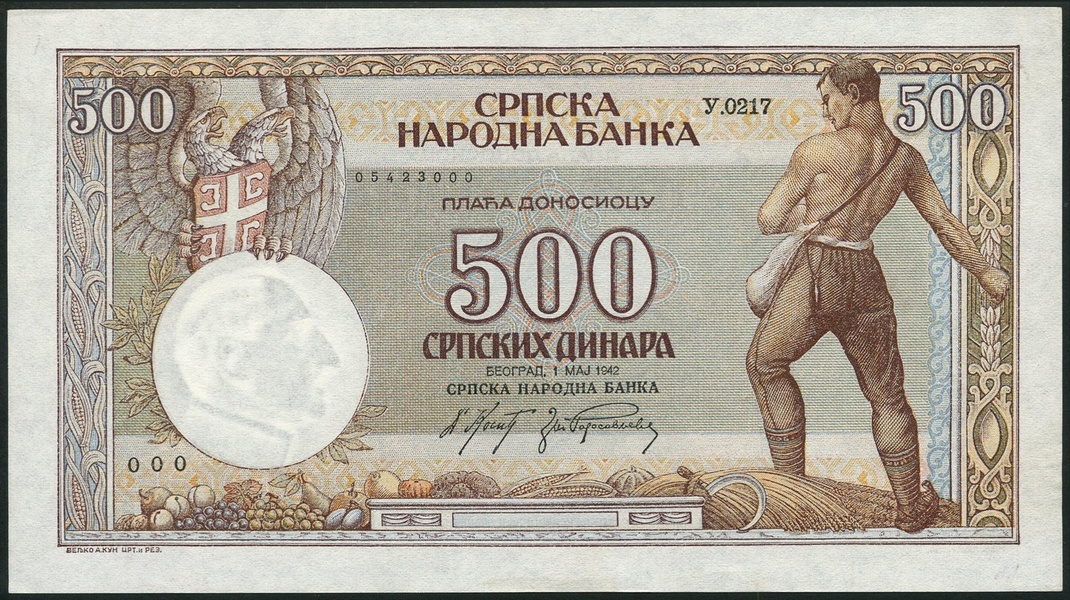 Serbian National Bank, 20, 50 and 500 dinara, 1 May 1942, blue, brown and multicoloured respectively, first with V. Karadzic at right