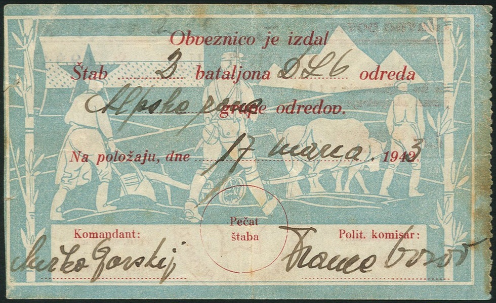 Yugoslavia, partisan certificate of WWII, 2500 lit, 1943, serial number 1994, red text on light blue underprint, ploughing scene in background, manuscript date and signatures on reverse