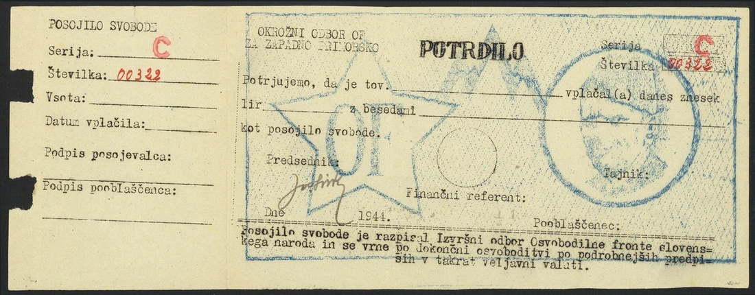 Partisan Certificates 'Potrdilo', Primorsko District, blank certificate for either 128 or 200 lir, 194-, serial number C00322, black on blue underprint, Tito at right