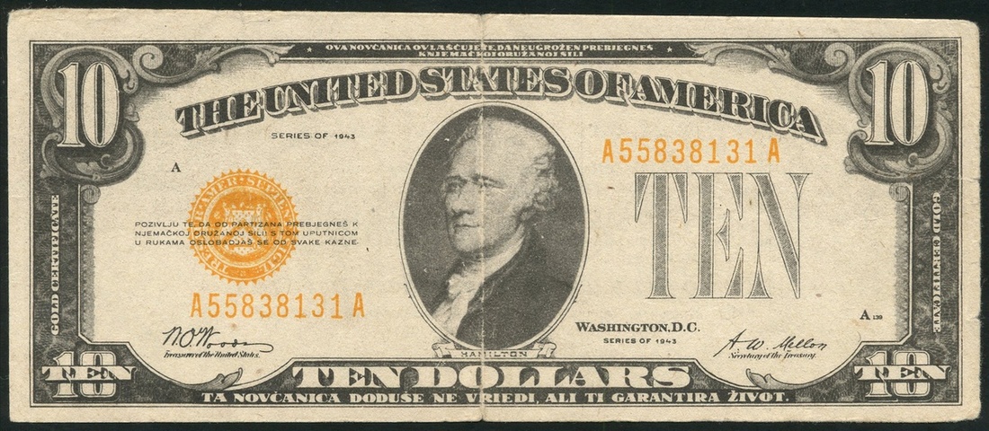Yugoslavia, safe conduct pass on a copy of a United States $10 gold certificate of 1943 with black text on reverse Ueberlaufer-Ausweis and promising freedom from arrest to surrendering partisans