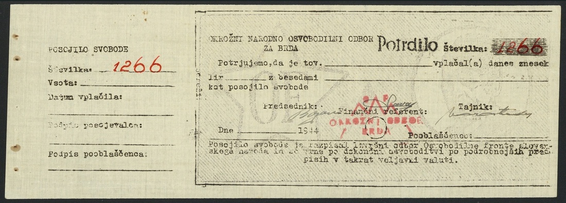 Partisan Certificates 'Potrdilo', Brda, blank certificate for either 2000 or 10000 lir, 194-, serial number 1266, black on grey underprint, Tito at right, red handstamp at centre