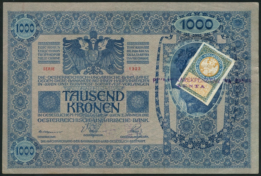 Kingdom of Serbia, Croatia and Slovenia, 1000 kronen (6), 1902, blue, ornately patterned, double headed eagle top centre left, each bearing a blue/orange stamp overprinted with city name