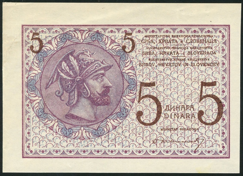 Kingdom of Serbs, Croats and Slovenes, Yugoslavia, 5 dinara, ND (1919), lilac and pale blue, helmeted male head at left, reverse lilac, value and caduceus