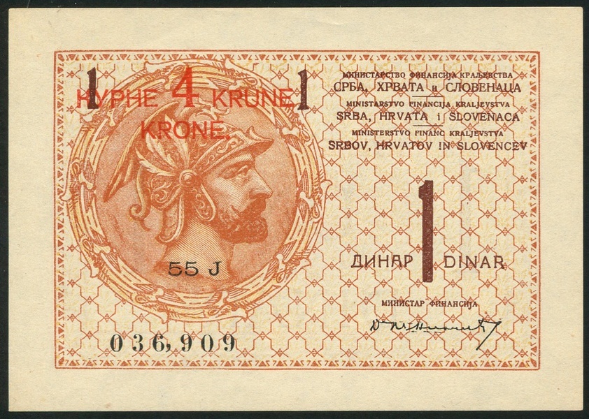 Yugoslavia, Kingdom of Serbs, Croats and Slovenes, 1/2 dinara, mauve and blue-grey, 1 dinar, brown, 25 para, blue and grey-green, 1/2 dinara with red 2 krone overprint, another example with overprint inverted, 1 dinar with red 4 krone overprint and 5 dinara, mauve, helmeted male head at left and with red 20 krone overprint, all 1919-1921