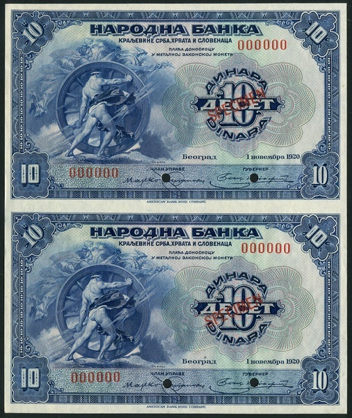 (x) National Bank, Kingdom of Serbs, Croats and Slovenes, uncut pair of specimen 10 dinara, 1 November 1920, zero serial number, blue on multicolour underprint, allegorical figure representing 'Progress' at left, value at right centre and each corner, reverse rocks and mountains, specimen cancellation holes, overprinted SPECIMEN,
