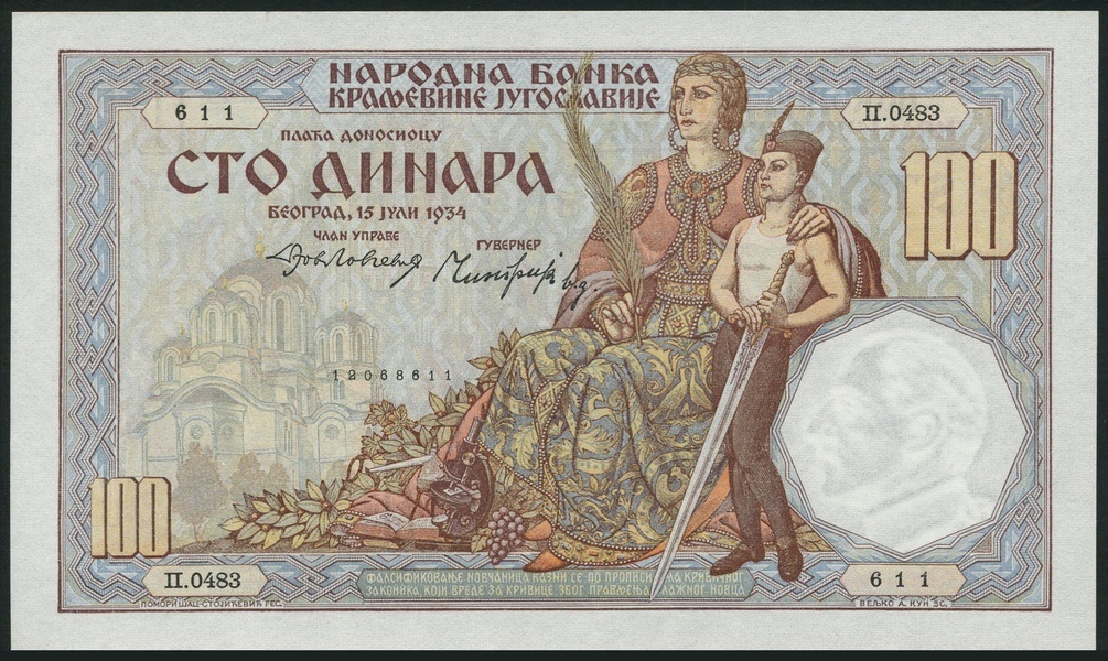 National Bank of Yugoslavia, a group comprising 100 dinara, 1929, 50 dinara, 1931, serial number P.070073520 and a counterfeit example, 1000 dinara 1931, 20 dinara, 1936, 100 dinara, 1934,