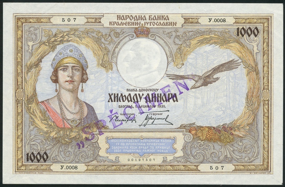 National Bank of Yugoslavia, specimen 1000 dinara, 1931, serial number Y.0008 507, multicolour, Queen Marie at left, eagle in flight at right, purple SPECIMEN overprint, 500 dinara, 1935, serial number Y.0293 589, green on multicolour, Peter II at left, arms at centre