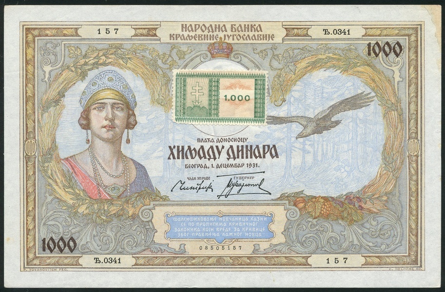 National Bank of Yugoslavia, 1000 dinara, 1931, serial number T 0341 157, multicoloured, Queen Marie at left, crown top centre, eagle in flight at right, adhesive Bacska stamp at centre, reverse multicoloured, maiden at left, Ceres, maiden at right (Yugoslavia), arms at centre
