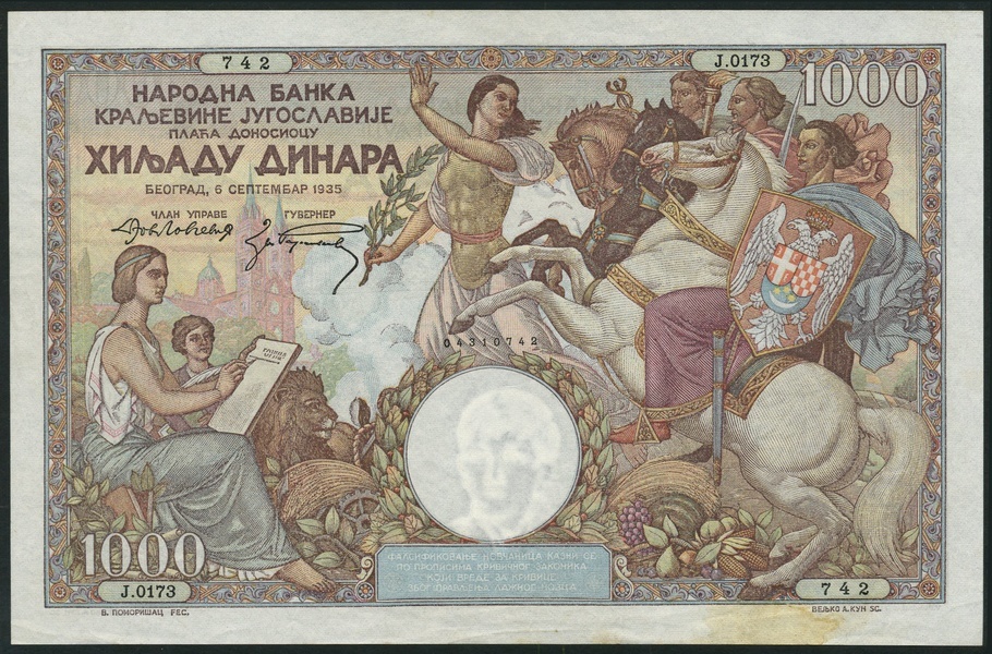 National Bank of Yugoslavia, 1000 dinara, 1935, serial number J.0173 742, brown on multicolour, group of allegorical figure with horses at right, arms at right, revers blue and brown