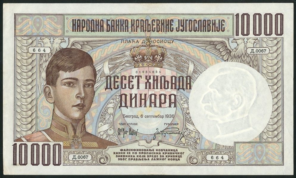 National Bank of Yugoslavia, 10,000 dinara, 6 September 1936, serial number 000.67 664, brown on multicolour, King peter II at right, crown at top centre, reverse bro0wn, value at centre, man and women at right
