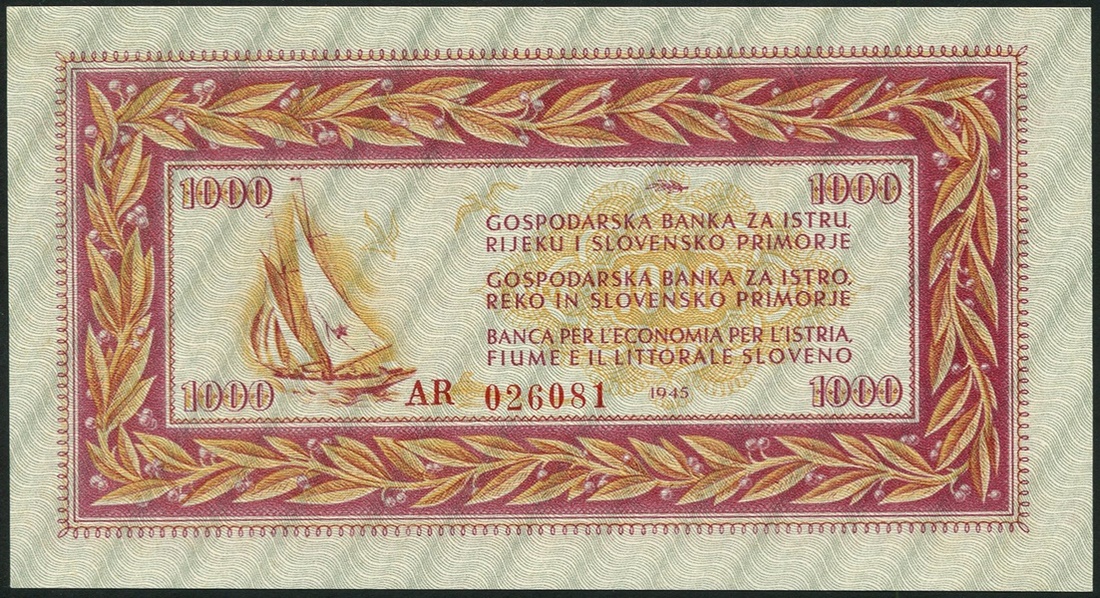 Yugoslavia, Istria/Rijeka, Slovene State Bank, 1 lira, 5,10,20 (2) lire, 1945, first four without serial numbers, balance, 50 lire (2), 100 lire, 500 and 1000 lire with serial numbers