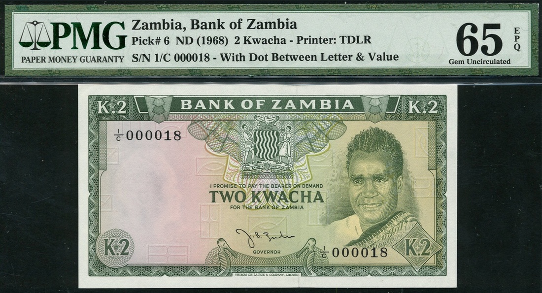 Bank of Zambia, 2 kwacha, 1968, serial number 1/C 000018, green on multicolour underprint, portrait President Kenneth Kaunda at right, arms top centre, reverse, copper mine