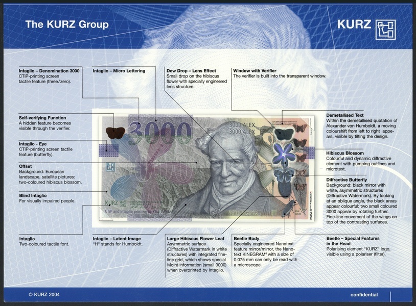 (x) Kurz Group, a series of seven presentation wallets detailing a 'Modular Banknote Concept', presumably designed to showcase all the various security features available, and enable a buyer to choose which to use on their banknotes. Each wallet contains a slightly different test note and details a different feature with the help of a transparent overlay,