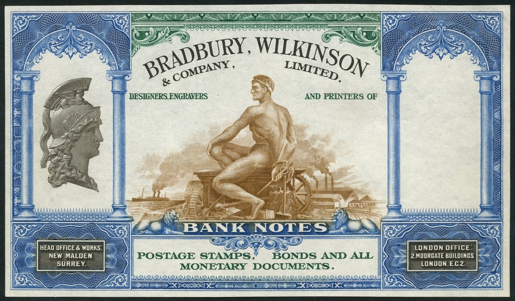 Advertising Note, Bradbury Wilkinson & Company, Limited, uniface, blue, green and brown, arched columns at left and right, head of allegorical figure in profile at left, seated man at centre flanked by ship at left and factory at right, also, experimental design, various shades of green, portrait at centre, ornate border and guilloche patterns