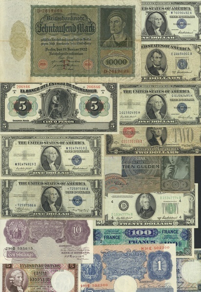 A mixed world lot including El Banco de Estado de Chihuahua, Mexico, remainder 5 pesos , 1913, Iceland, 5 and 10 kronur, law of 1928, signature 1, AMC France 100 francs, Peppiatt blue £1 and mauve 10/-, Netherlands 10 gulden and US dollars ($31 face value), Germany 100 marks, 1922
