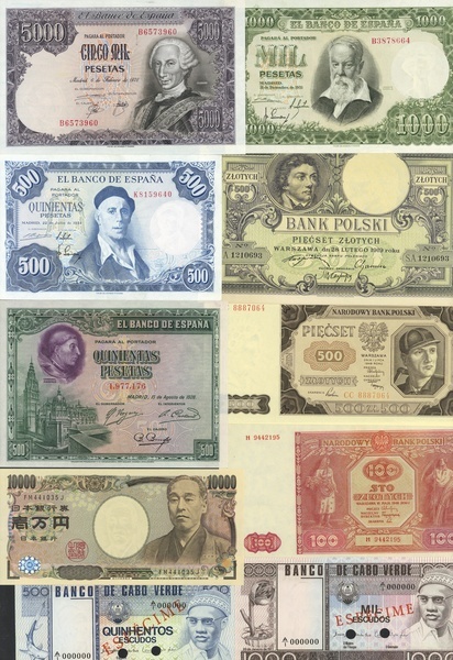 a group of mixed world banknotes, comprising, Banco de Cabo Verde, specimen 500 and 1000 escudos, 20 January 1977, zero serial numbers, both depicting A Cabral at right, reverse harbour scene and agriculture scene respectively, Bank Polski, 500 Zlotych, 1919, serial number S.A. 1210693, 100 Zlotych, 1946, serial number H 9442195, 500 Zlotych, 1948, serial number CC 8889064, and, Nippon Ginko, Japan, 10000 yen, ND (2004), serial number FM441035J, brown on multicolour underprint, Y Fukuzawa at right, reverse phoenix from the Boyhdoh-in Temple, El Banco de Espana, 500 pesetas, 1928, green, Cardinal Cisneros at top left, 1000 pesetas, 1951, green, Sorolla at centre, 500 pesetas, 1954, blue, Picasso at centre and 5000 pesetas, 1976, purple, King Carlos at right