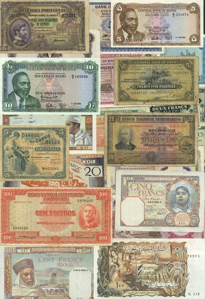 A selection of Africa comprising Morocco, 20 francs, ND (1943), 5 dirhams, 1969, Algeria 2 francs (2), 5 francs, 1942, 5 francs, 1941 and 100 francs, 1945, 100 francs, 1970, Egypt 25 piastres, 1951, Mozambique 20 and 100 escudos, Belgian Congo 5 francs, 1943, Kenya 5 shillings (7 consecutive), 1966, 5 shillings, 1973, 10 shillings (5 consecutive), 1966, Nigeria 5 shillings, £1 (3), Uganda 5 and 10 shillings, Rhodesia $1, 1979, Angola 2 1/2 angolares, 1942