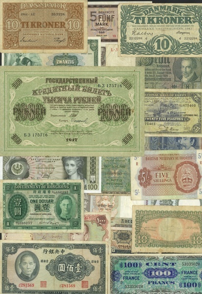 (x) An interesting group of world notes, including notes from Hong Kong, Iran, Netherlands, Malaya, Iraq (2), Egypt (4), Nepal (2), Syria, Angola, India (6), Ceylon (3), Cyprus, Germany (4), Austria, British Military Money, France, Russia, China, Denmark, 10 kronor, 1944, 10 Kronor, 1945 (Pick 36-7),