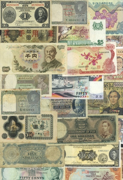 Board of Commissioners of Currency, Singapore, a selection comprising $1 (4), $5, $10 (4), $50 (3), Straits Settlements $1, 1933, Fiji, 5 shillings (2), 1964,1951, 50 cents (2), Philippines 20 centavos (2), 5 pesos (3), Western Samoa $1,5,20, Vanuatu, 1000 vatu, Tahiti 1000 francs (3) and 5000 francs, French Overseas issue 500 francs, New Zealand 10 shillings, Fleming signature, Hong Kong 1 cent (3), $1 (2), 1949,1957, Cambodia 1 piastre, Japan 50 sen, 10 yen (4), 1000 yen (3), Burma 1 rupee George VI and India 1 rupee and 5 rupee, both George VI, Netherlands Indies 1 gulden, 1943