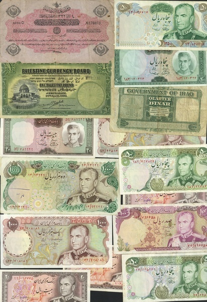 Middle East, Palestine, £1, 1939, Ottoman 1/2 livre, AH1332, Iraq, 1/4 dinar, Faisal II as a youth at right, Pahlavi 20 rials (4), 50 rials (6), 100 rials, 1000 rials (2) and 10000 rials