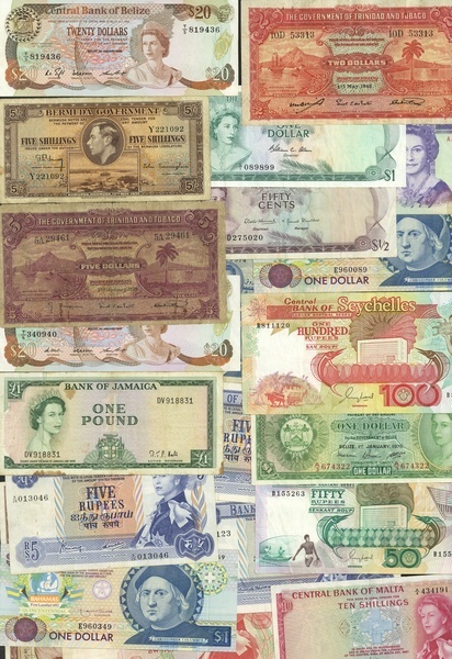 Government of Belize, $1, 1976, Monetary Authority $1, 1980, Central Bank, $20 (2), 1986,1987, brown, Elizabeth II at right, arms top left, $1 (3), $2 (2), Bahamas 50 cent, $1 (5), Bermuda 5 shillings, 1937, Trinidad and Tobago $5, 1939 and $2, 1942, Mauritius 5 rupees (4), 10 rupees, Malta 1 shilling (2), 10 shillings and £1, Seychelles, 50 and 100 rupees, ND (1989), red, Jamaica £1, Hall signature, Cyprus 3 piastres, 1943