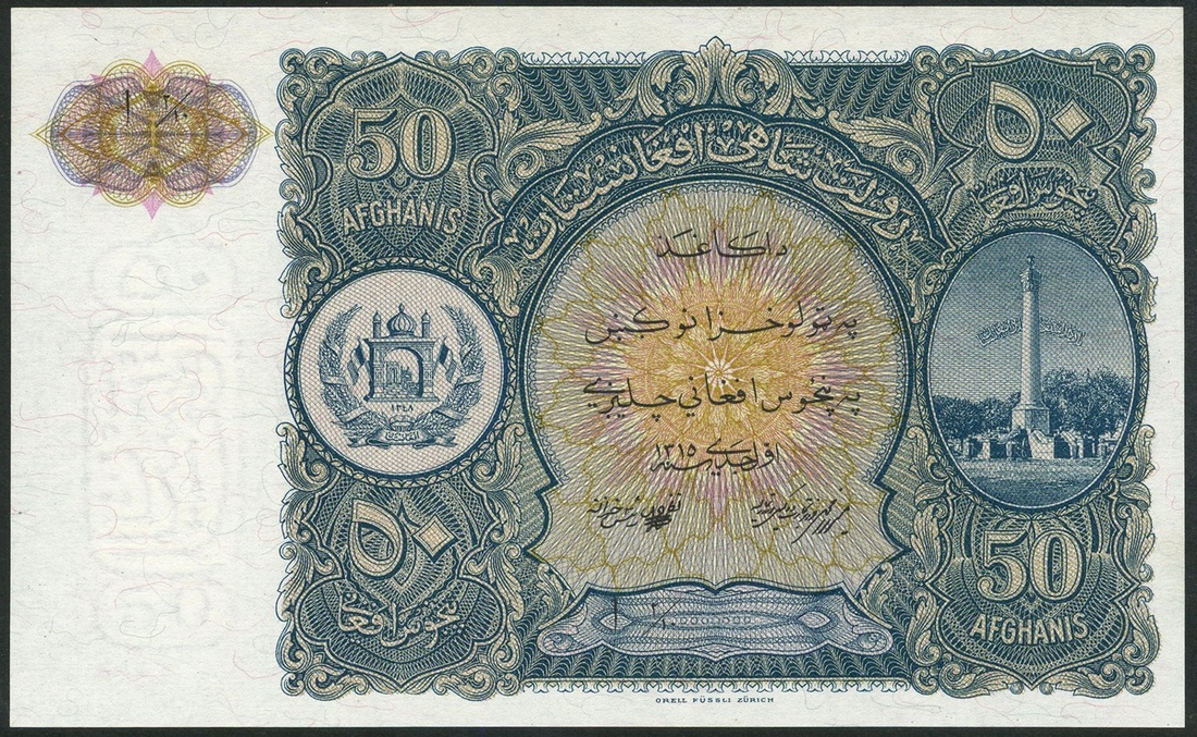 Afghanistan Ministry of Finance, 10 and 50 afghanis, 1936, no serial numbers, brown and blue respectively on multicolour underprint, Independence Monument at right, arms at left, value at top left and right