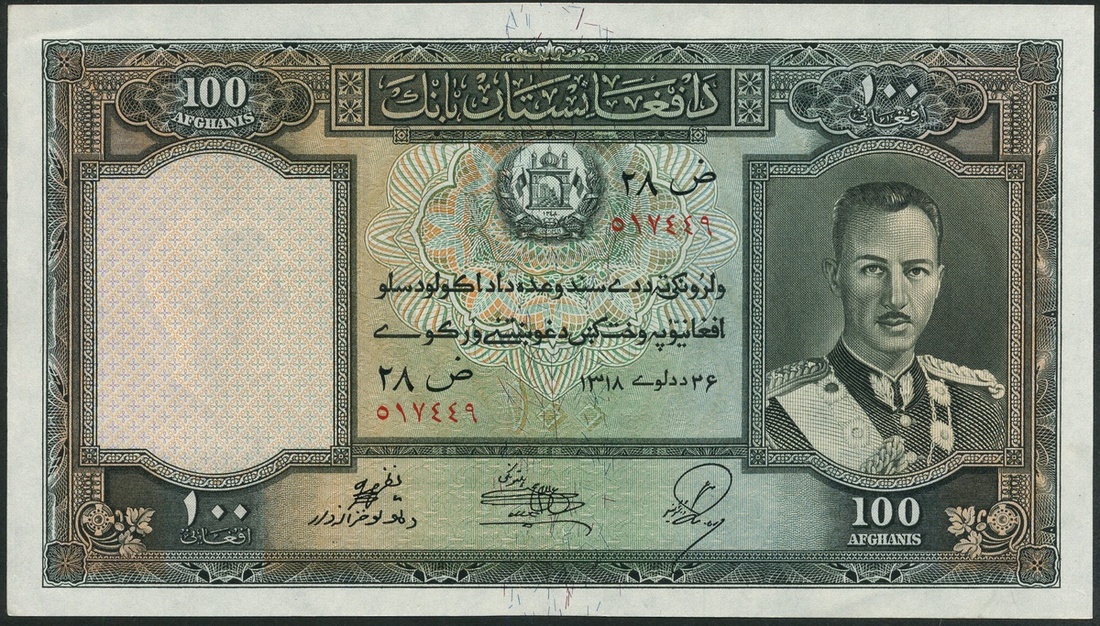 (x) Bank of Afghanistan, 2 (2), 5, 50 (2) and 100 afghanis, 1318 (1939), brown, green, blue and dark green respectively, King Muhammad Zahir at left or right, arms at top centre