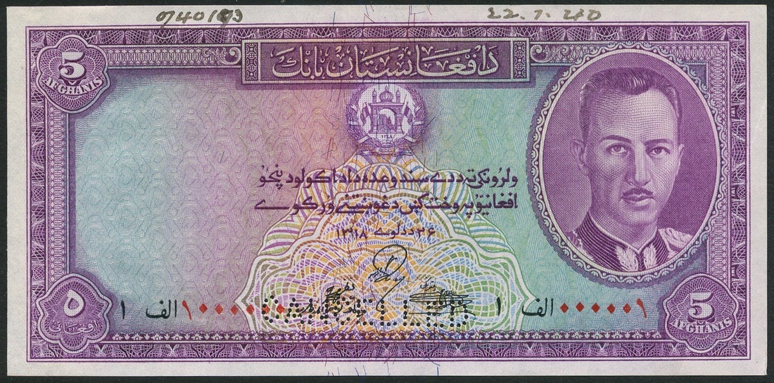 (†) Bank of Afghanistan, printers archival specimen for 5 afghanis, SH1318 (1939), red serial number prefix 1 000001-1000000 and prefix 2 000001-1000000, purple on green and multicolour underprint, King Muhammad Zahir at right, arms at top centre, value at left, reverse purple, view of Hindu Kush mountains at centre