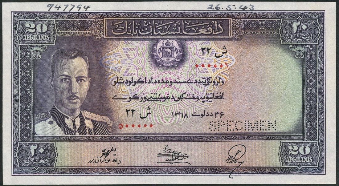 (†) Bank of Afghanistan, specimen 20 afghanis, 1318 (1939), prefix 22, purple on multicolour underprint, King Muhammad Zahir at left, arms at top centre, value at each corner
