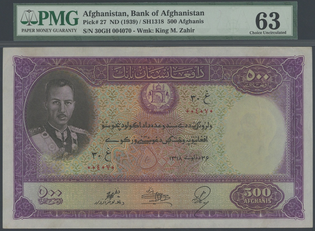 (x) Bank of Afghanistan, 500 afghanis, 1318 (1939), red serial number 30GH 004070, black and violet on multicolour underprint, King Muhammad Zahir at left, arms at top centre, value at corners, reverse black on multicolour underprint, Blue Mosque at centre, value at right and in corners