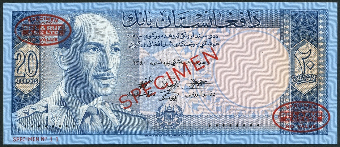 (†) Bank of Afghanistan, a selection comprising specimen 10 afghanis (2), 1961, brown, 1973, green, specimen 20 afghanis (2), 1961, blue, 1973, purple, specimen 50 afghanis, 1967, 1973, both green, portraits of Muhammad Zahir on the earlier dates, Muhammad Daud on the layer dates