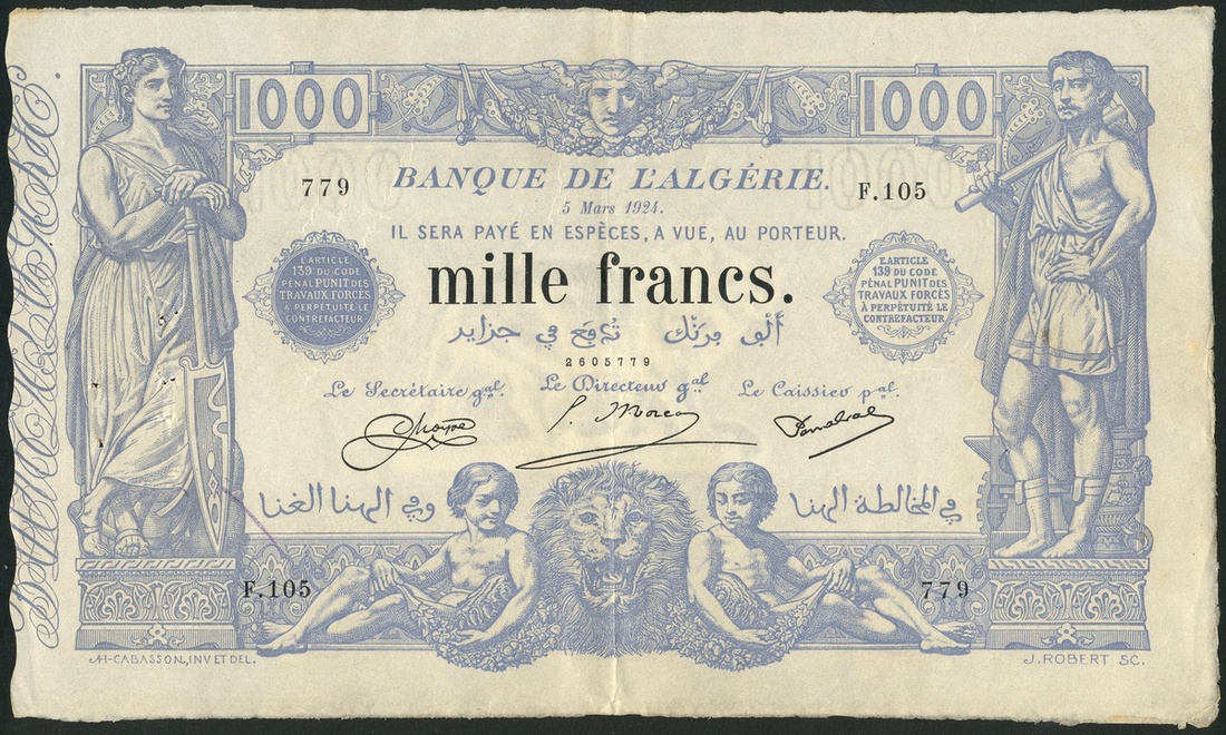 Banque de l'Algerie, 1000 francs, 5 March 1924, serial number F.105-779, blue and white, maiden at left, Mercury at right, Moyse, Moreau and Penalva signatures