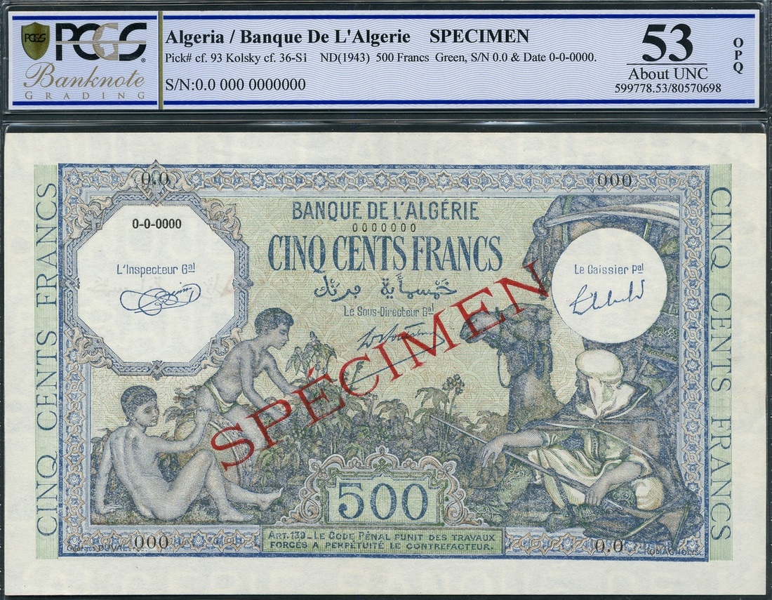Banque de l'Algerie, specimen 500 francs, ND (1943), zero serial numbers, blue-green, Berber and camel at right, children at left, Berino, Routaboul and Sebald signatures