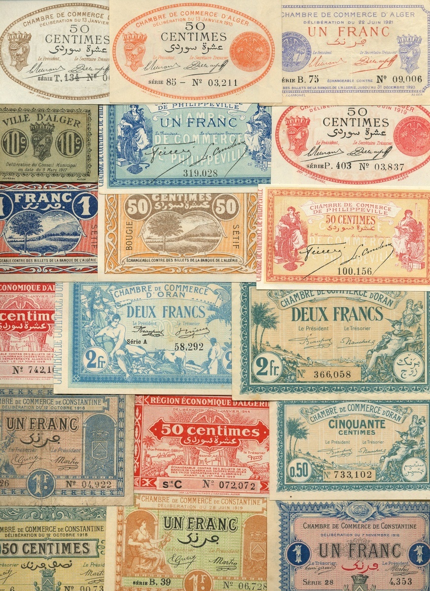 Algeria, a group of small size notes including Region Economique d'Algerie 50 centimes (6), 1 franc (7), 2 francs (3), also a selection from Constantine (13), Oran (15), Bougie (10), Bone (4), Philippeville (11), Gafsa (4), Alger (8), Sidi-Bel-Abbes, Tunis (5)