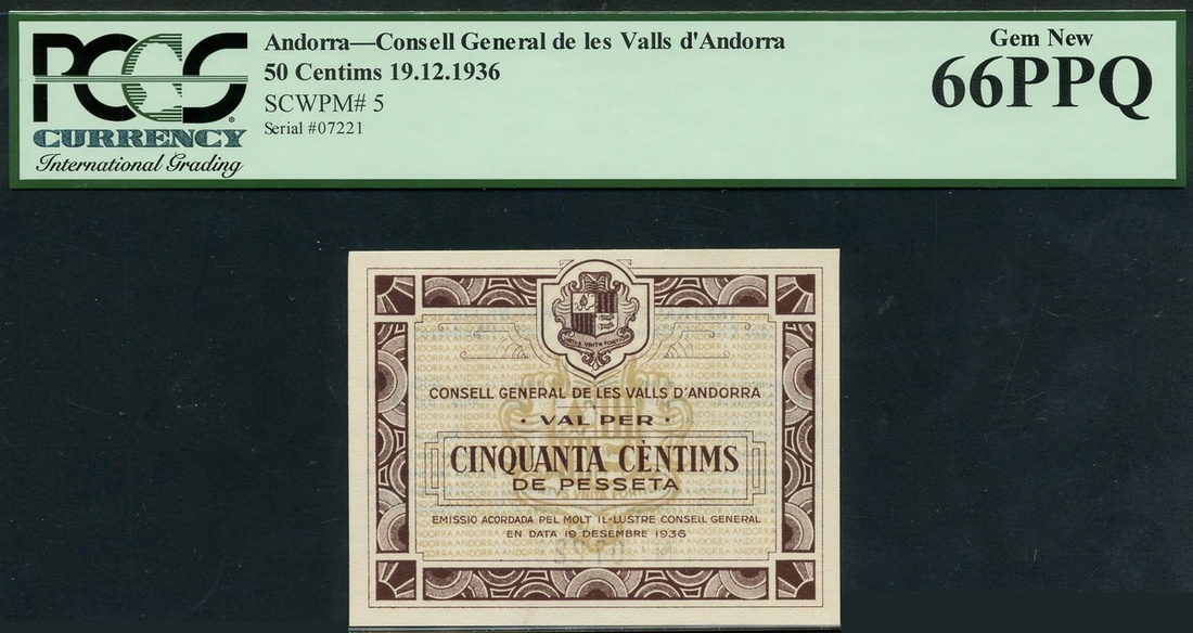 Consell General de les Valls d'Andorra, 50 centims, 19 December 1936, serial numbers 07221, brown and pale green, arms top centre, reverse text, also 1 peseta, serial number 08128, brown and pink, arms top centre