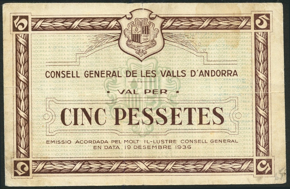 Consell General de les Valls d'Andorra, 5 pesetas, 19 December 1936, serial number 00389, brown and pale green, arms top centre, reverse text