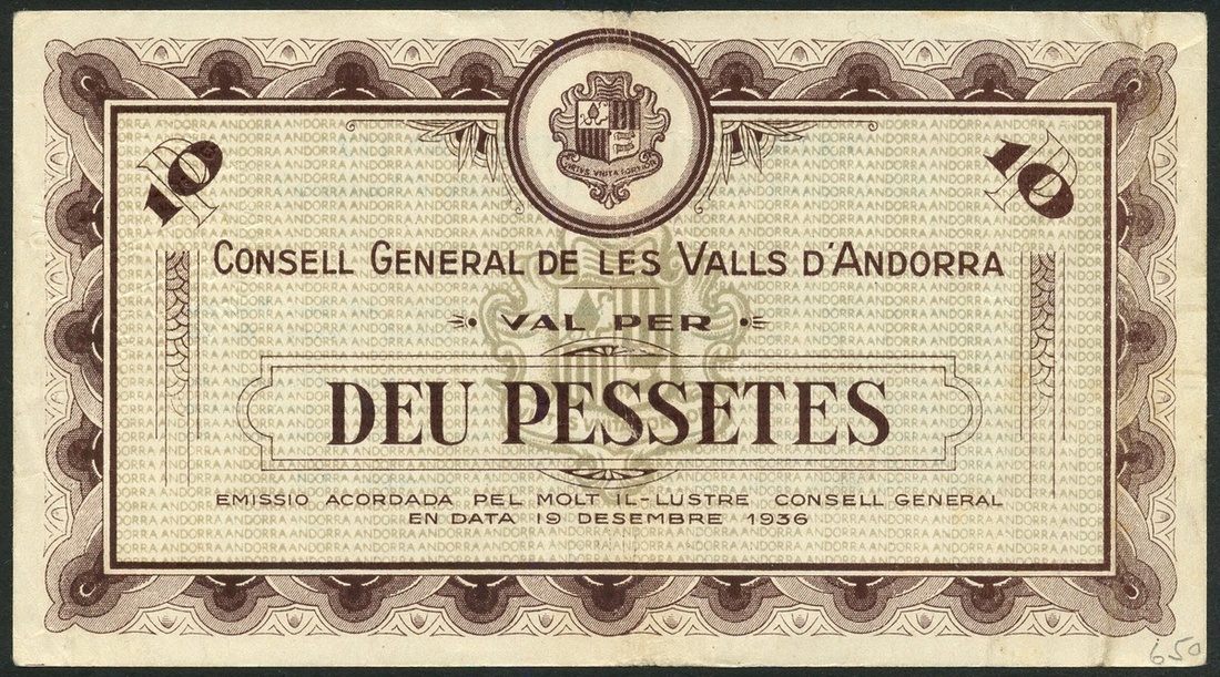 Consell General de les Valls d'Andorra, 10 pesetas, 19 December 1936, serial number 00645, brown and pale grey-green, arms top centre, reverse text