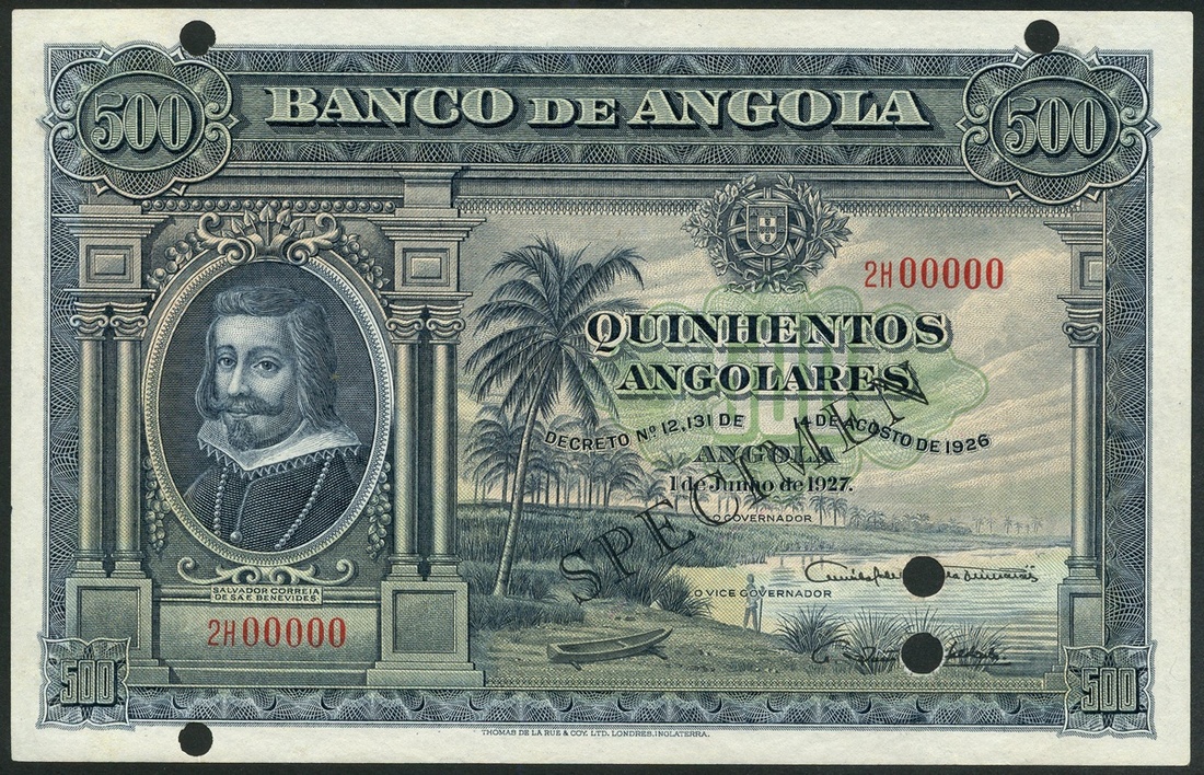 (x) Banco de Angola, specimen 500 angolares, 1 June 1927, red serial number 2H 00000, blue on green underprint, Salvador Correia de Sa e Benevides at left, value at corners, reverse blue, eagle at centre, value at left and right, two cancellation holes