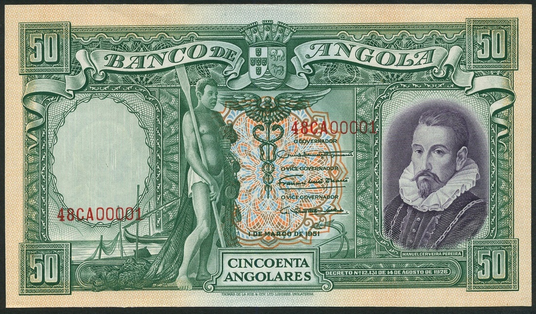 Banco de Angola, 50 escudos, 1 March 1951, serial number 48CA 00001, green, Pereira at right, arms and caduceus at centre