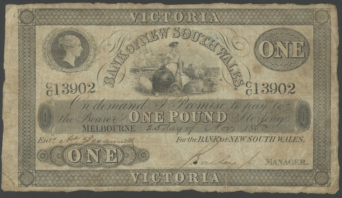 Bank of New South Wales, Australia, £1, Melbourne, 25 November 1863, serial number C/C 13902, black and white, maiden with caduceus and allegorical symbols of commerce and prosperity, young head of Queen Victoria laureate top left, value in oval top right, two manuscript signatures below, reverse value and engine turnings in brown